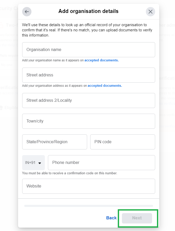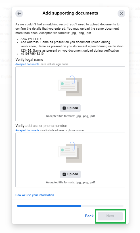 Herein below dialog box, fill in all the details same as mentioned in the documents, which will be uploaded in the following steps, and click on “Next” to continue.