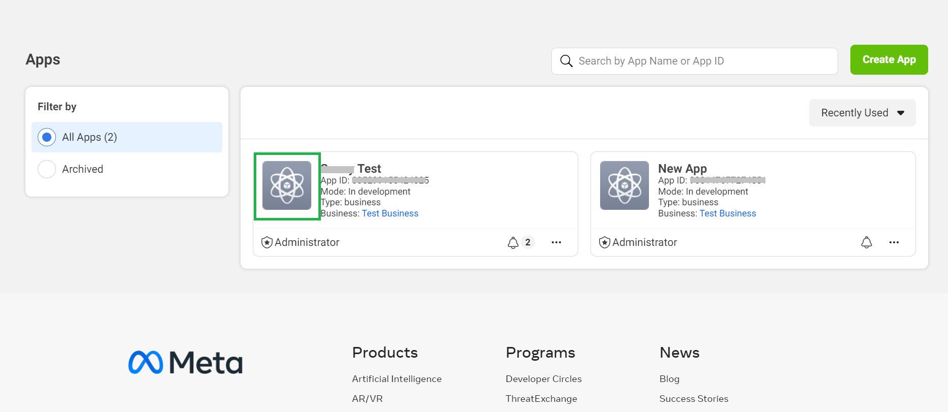 As soon as you click on “My Apps” you will see your apps created. Click on one of your apps as shown below.