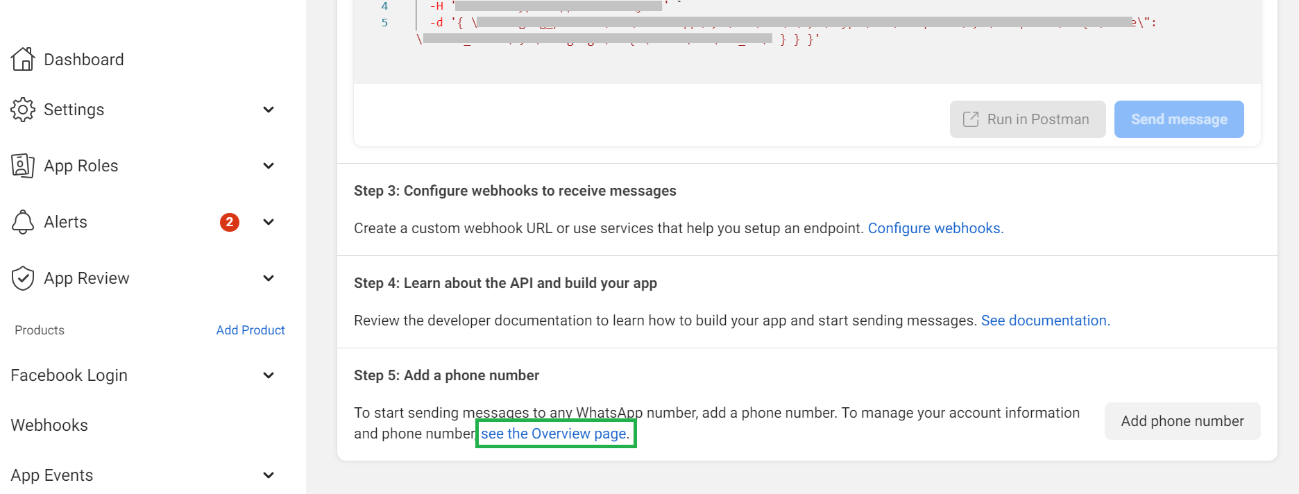 In “Getting started” click on “see the Overview page” in “Step 5: Add a phone number”.
