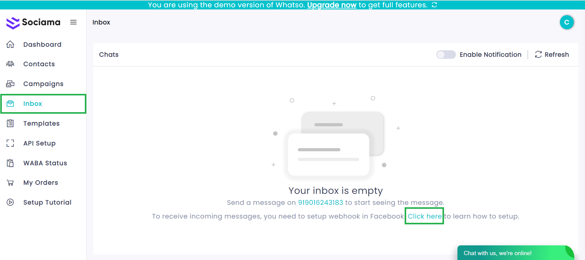 You’ll be directed to the app.sociama.net dashboard page. As soon as you click on Inbox, the empty page will appear(as shown below) as there is no chat in your inbox. Now to activate your inbox, click on “click here” and you will be guided for setting up your inbox.